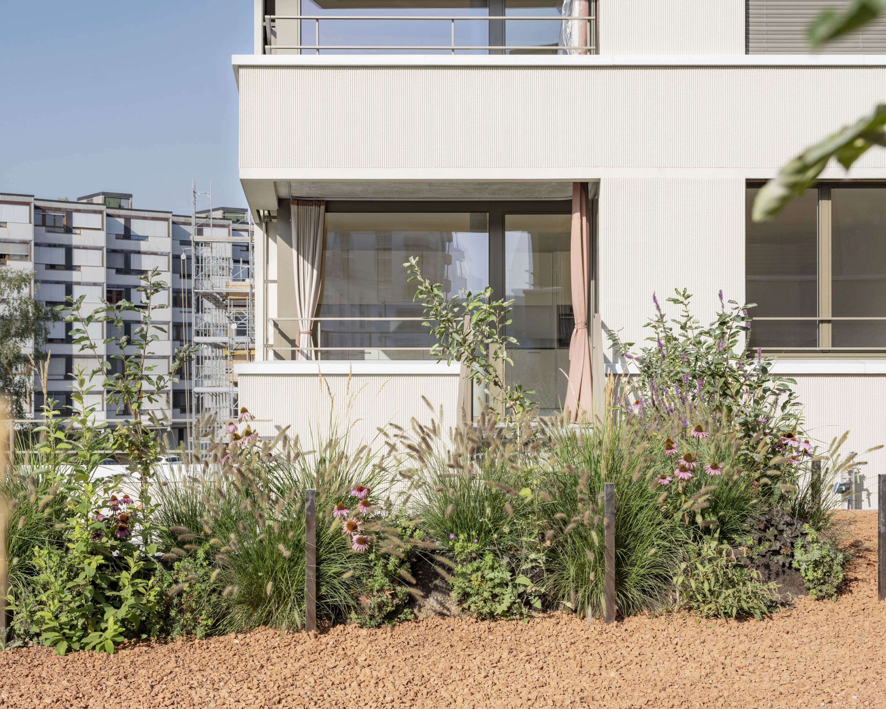 Le projet de la pièce urbaine B du quartier des Plaines-du-Loup sur le plateau de la Blécherette est situé au nord-ouest de la ville de Lausanne. Les quatre bâtiments des quatre maîtres de l’ouvrage / investisseurs cadrent un grand pré qui réunit les espaces collectifs.
